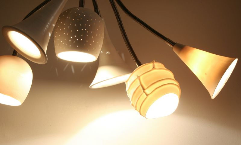 This Chandelier is a lighting flower arrangement of ceramic shades that light up through translucent porcelain, shade openings and perforated white clay.