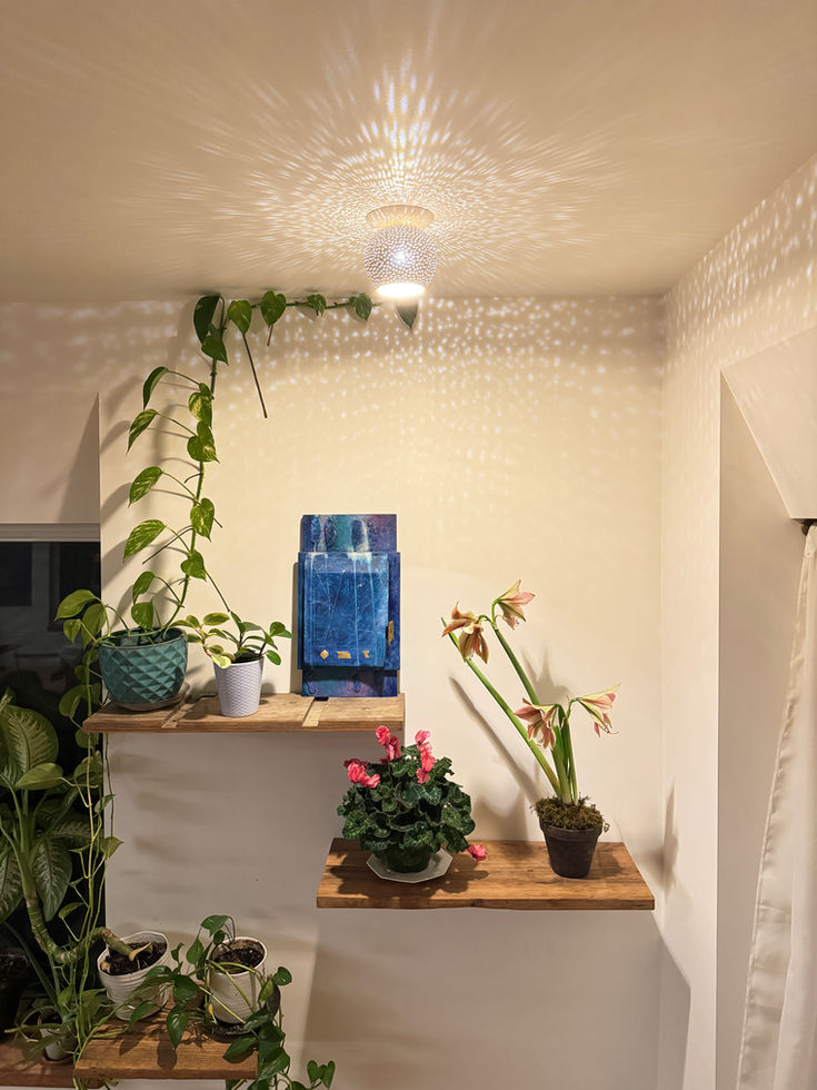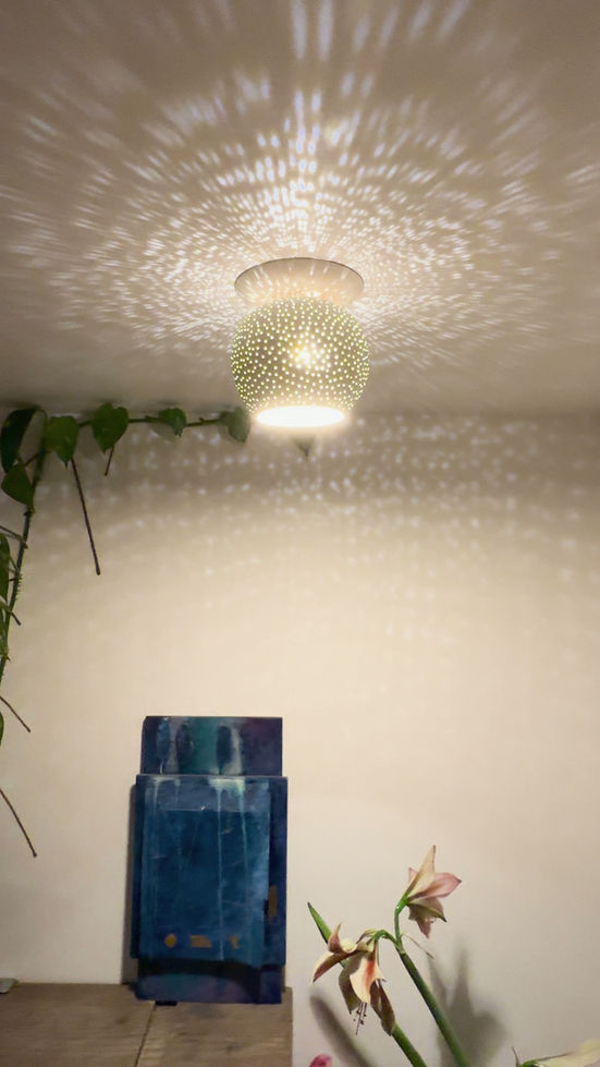 The Claylight series showcases handcrafted ceramic shades with intricate perforations, each one carefully detailed by hand. When lit, the shades emit a soft glow while projecting delicate patterns of light and shadow across your walls and ceiling—transforming the entire room's atmosphere.