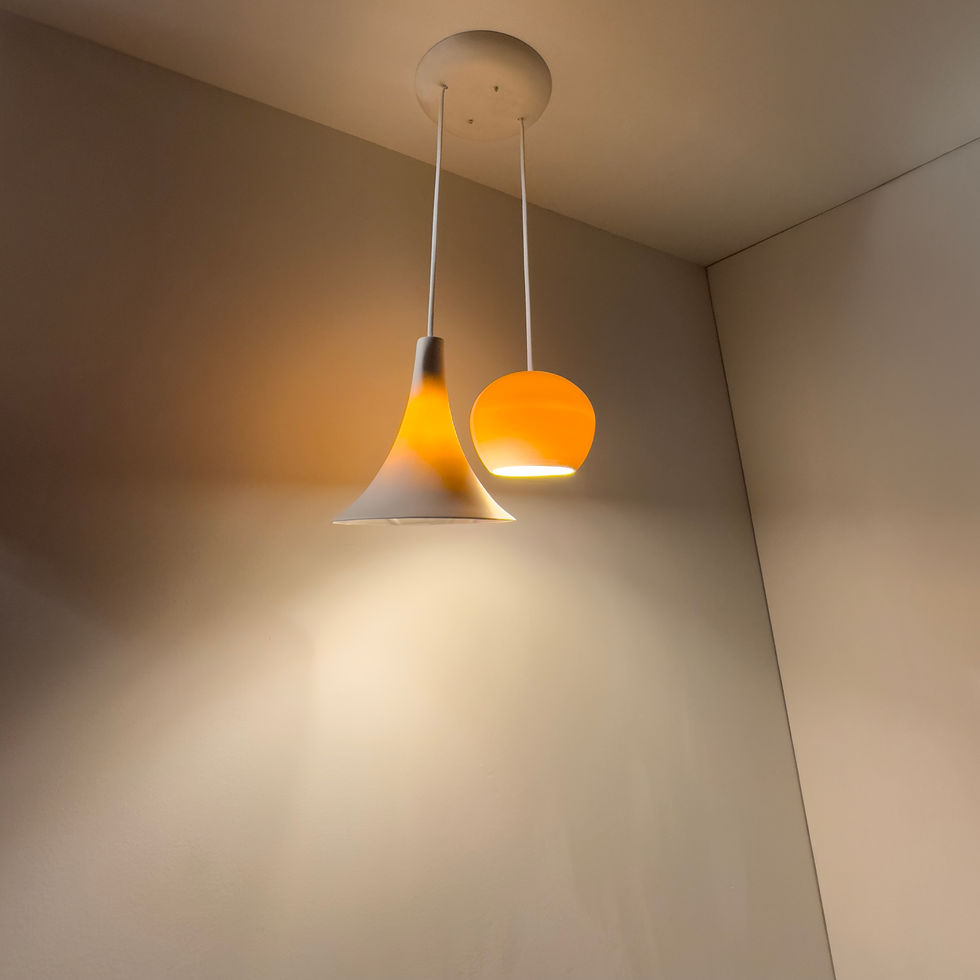 The chandelier's floating porcelain shades have a natural and timeless quality that is both utilitarian and sensual. They glow in an amber tone when the light is on and when the light is off they have a matte white ceramic surface.