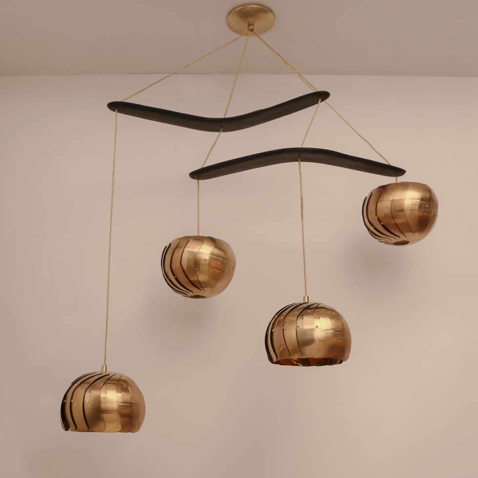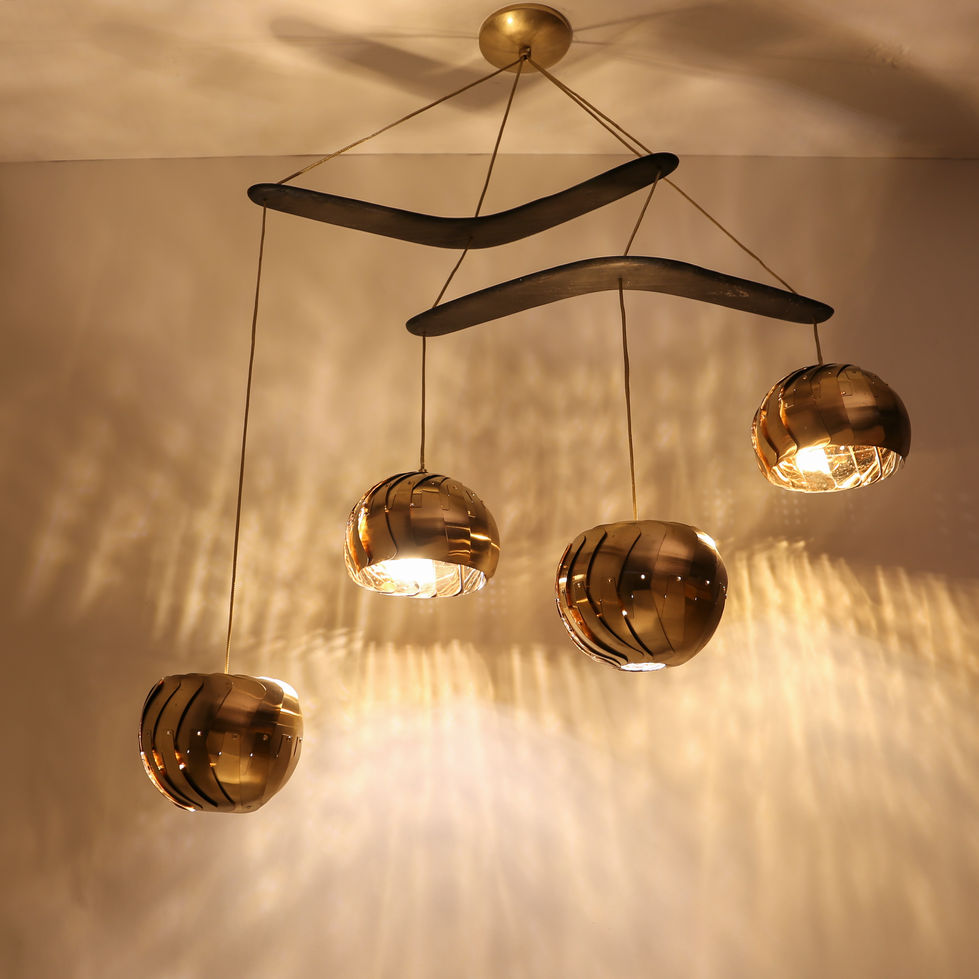 The Iris chandelier is composed of four Iris shades balancing off two black stained Australian wooden Boomerang. Each shade can be adjusted to have an upward pointing light, a downward pointing light, or a mixture of both. The reflective interior of the shades casts intricately patterned reflections that change as the light's configuration is changed. This would be the perfect chandelier for the center of a room or above your dining room table.